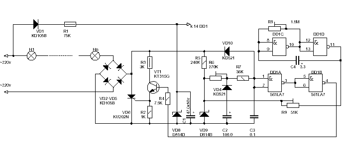 элементов DD1.1, DD1.2 через диод VD10 и открывшийся тиристор VD6.